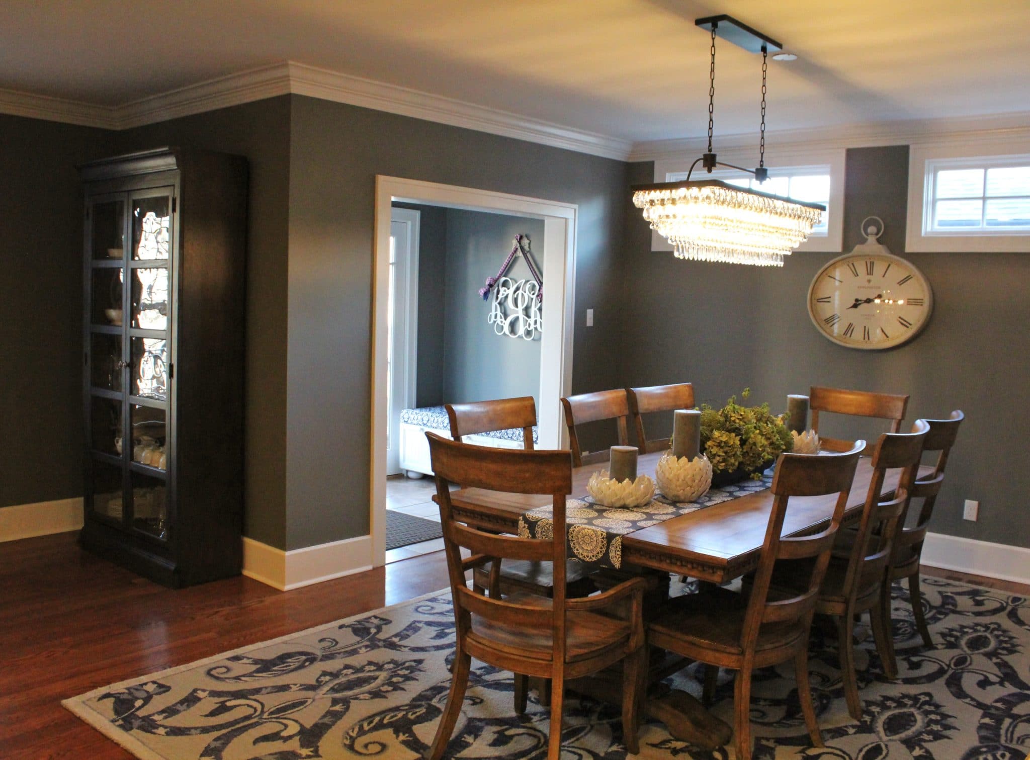 We chose a neutral gray base color in the hearth room and the breakfast room, then selected our rugs.