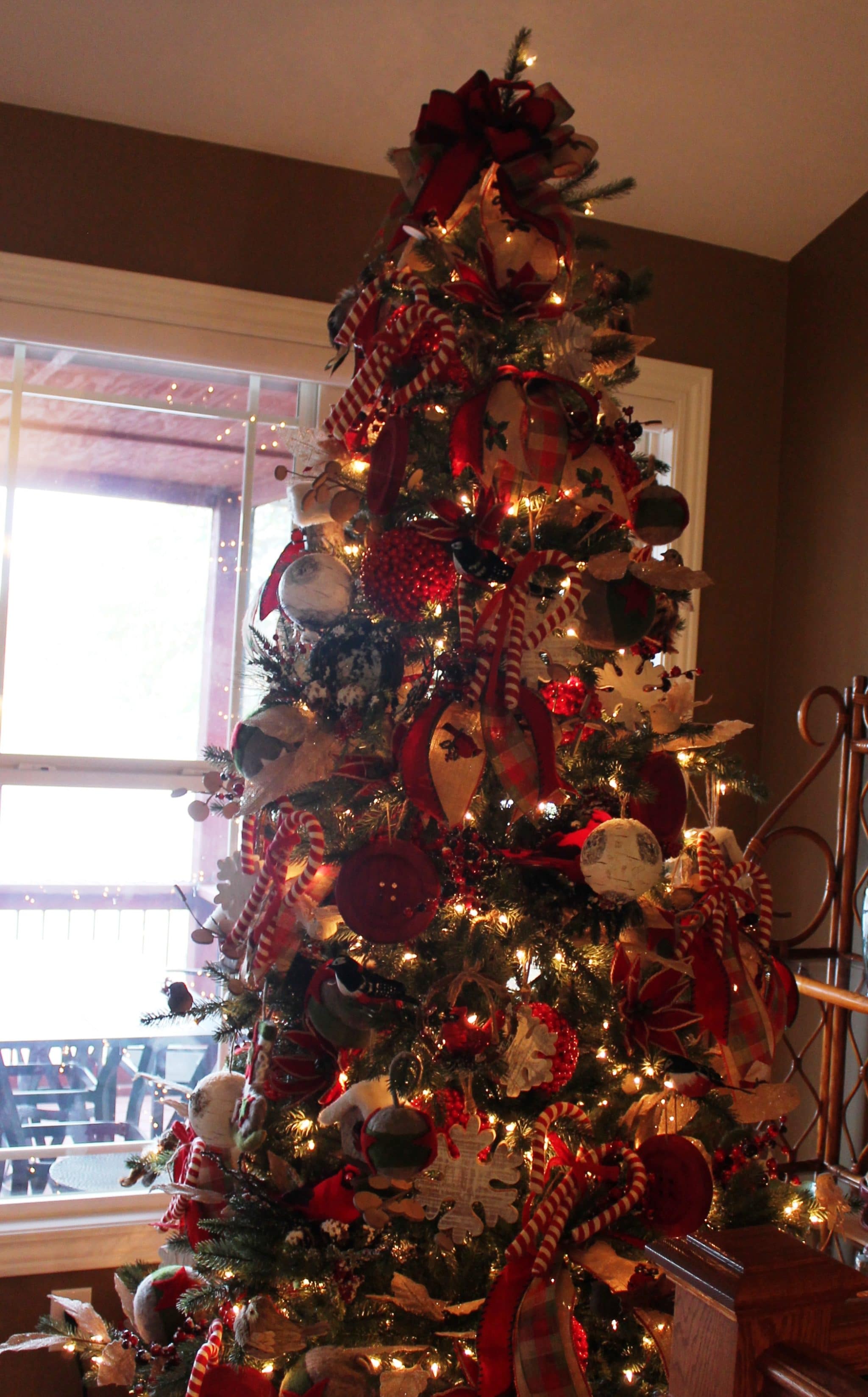 On the Snoopy tree, I used a white and red button garland with red bows. We displayed her singing Peanuts figurines at the base of the tree.