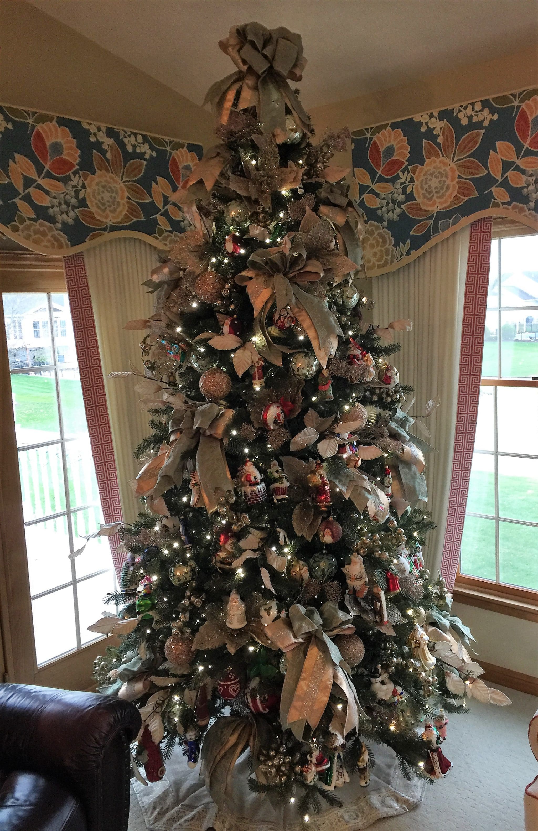 We mix traditional red, green and gold design elements with the homeowners’ sentimental ornaments and decorations.