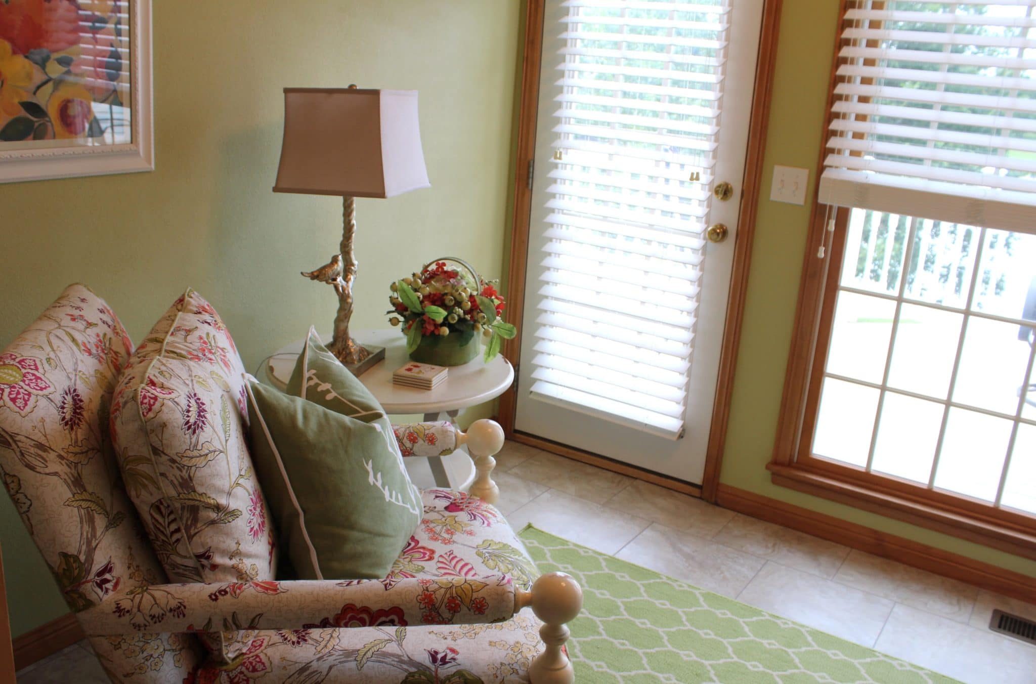 She brought me in to spruce up the space with visions of encouraging her husband to enjoy their mornings in the sunroom with a cup of coffee.